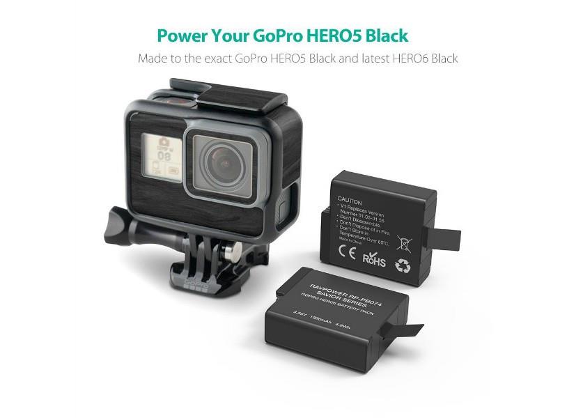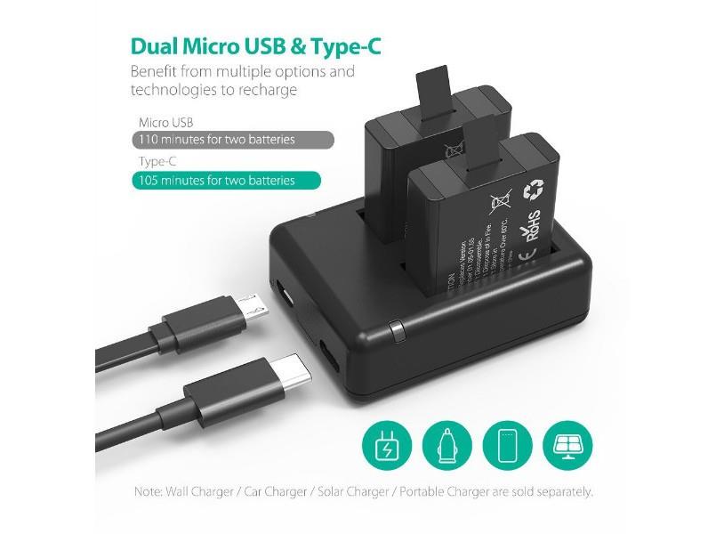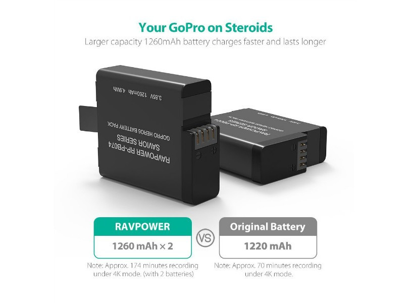 Bộ 2 pin và sạc kép RAVPOWER RP-PB074 là lựa chọn dự phòng hoàn hảo cho bạn với một sạc kép cho phép sạc hai pin cùng lúc và hai pin thay thế có thời lượng 1260 mAh mỗi pin giúp tăng thời lượng sử dụng lên gấp đôi: quay video 4K thời lượng 174 phút, trong khi pin theo máy chỉ quay trong 70 phút.