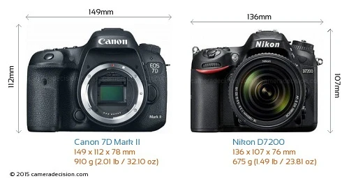 Máy ảnh Canon 7D Mark II và D7200 là hai đại diện nổi bật của Canon và Nikon. Về ngoại hình, 7D Mark II to và nặng hơn một chút so với đối thủ Nikon D7200. Cụ thể, 7D Mark II sở hữu kích thước 149 x 112 x 78mm với trọng lượng tương đương. . .