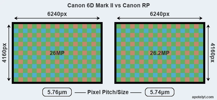 Cả Canon EOS RP và Canon EOS 6D Mark II đều có cảm biến độ phân giải 26MP Fullframe, cho nên kích thước và độ phân giải của cảm biến không phải là điểm khác biệt giữa hai máy ảnh này.