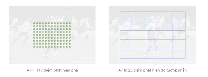 Sony A7 II có hệ thống hybrid cũ hơn với 117 điểm phát hiện pha và 25 điểm tương phản. Các điểm phát hiện pha bao phủ một vùng nhỏ hơn của cảm biến.