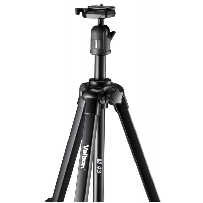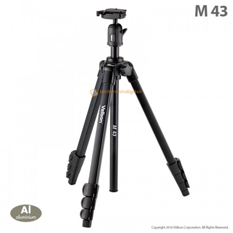 Chân máy Velbon M43 được làm bằng nhôm để tăng cường độ vững nhưng vẫn đảm bảo trọng lượng nhẹ. Chân máy ảnh sử dụng miếng Plate theo dạng thao tác nhanh giúp cho việc lắp và tháo máy ảnh khỏi chân được dễ dàng. Chân vít cắm head chuẩn UNC 1/4 thông dụng với bất kỳ máy ảnh nào. Trục trung tâm có thể kéo lên được, đảm bảo chiều cao tác nghiệp.