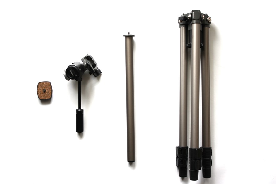 Chân máy có thể được tháo rời thành bốn phần; phát hành nhanh, đầu, cột giữa và chân. Tách cột giữa khỏi chân (hoặc tháo đầu) làm cho giá ba chân ngắn hơn 10 cm (4 inch) có thể hữu ích khi di chuyển.