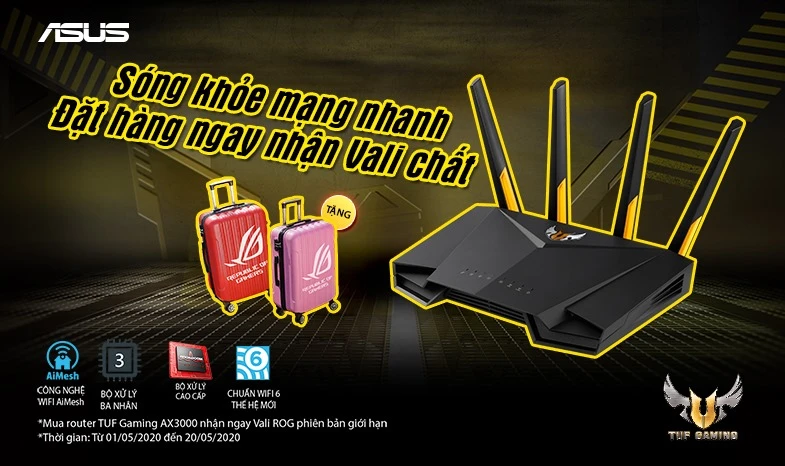 Nhằm tạo điều kiện giúp các khách hàng tiềm năng có cơ hội sở hữu một cục router Wifi chất lượng trong tháng năm này, Bình Minh Digital mang tới chương trình ưu đãi đặc biệt: “Mua router tháng 5 nhận ngay quà khủng”. 1. Mua router TUF Gaming AX3000 tặng Vali ASUS ROG phiên bản giới hạn Sóng khỏe,. . .