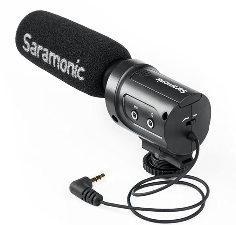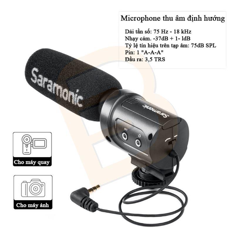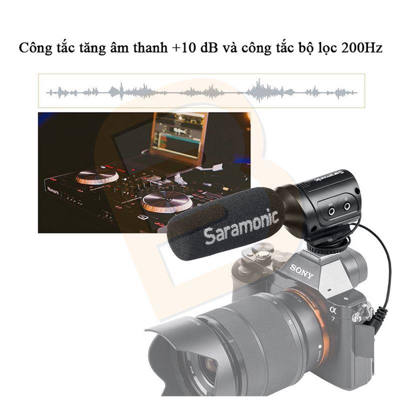 Saramonic SR-M3 là một micro chuyên dụng ghi âm chất lượng cao cho máy ảnh DSLR, máy quay và các thiết bị ghi khác trong ứng dụng video, âm thanh và giọng nói. SR-M3 có bộ lọc cắt thấp 200Hz và công tắc mức âm thanh 10dB để tăng tính thông minh của cuộc đối thoại. Giắc cắm tai nghe cho phép bạn theo dõi âm thanh khi ghi âm. Đầu vào micrô thêm 3,5 micrô cho phép bạn kết nối thêm một micrô với máy ảnh / máy quay của bạn.