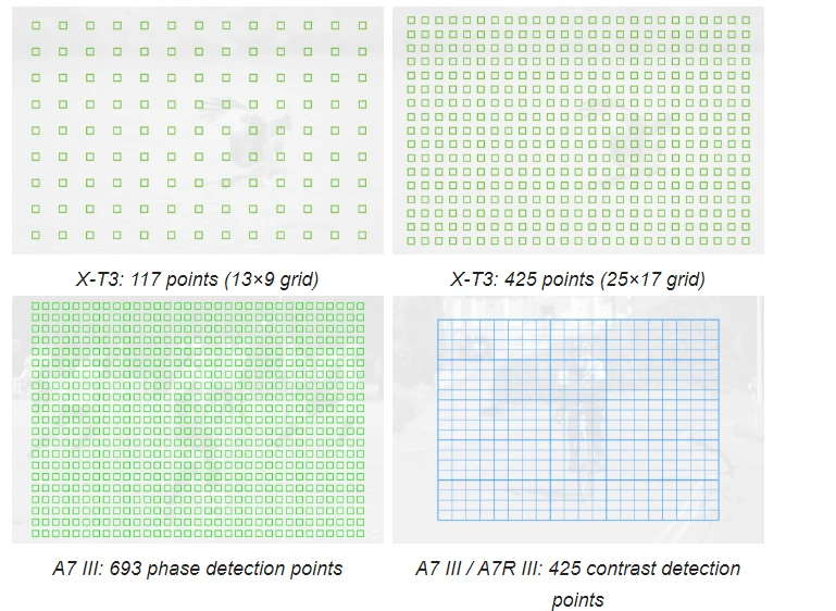 X-T3 tính năng lần lặp gần đây nhất được thiết kế bởi Fujifilm và bao gồm 117 (13 × 9 lưới) điểm có thể được chia thành 425 (lưới 25 × 17) với các cài đặt nhất định. Loại thứ hai bao phủ 99% bề mặt của cảm biến trong khi với lưới 13 × 9, độ bao phủ hơi nhỏ hơn (chiều ngang 91% và chiều dọc 94,5%).