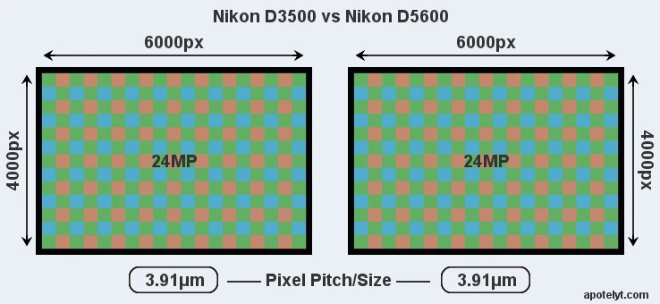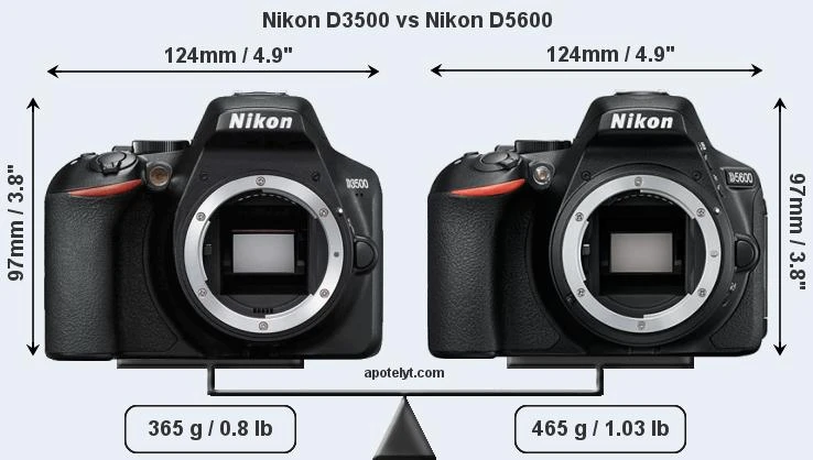 Cả hai máy ảnh Nikon D3500 và Nikon D5600 đều có cảm biến APS-C 24pm và có hệ số định dạng là 1,5. Cảm biến APS-C được tích hợp trong cả hai máy ảnh có tổng diện tích khoảng 367mm² . Cả hai máy ảnh đều có tỷ lệ khung hình riêng (chiều rộng cảm biến đến chiều cao cảm biến) là 3: 2. Hệ thống lấy nét AF 11 điểm và dải ISO 100-25.600. D3500 và D5600 cũng có khả năng quay video 1080p ở tốc độ 60 khung hình/giây. Kết nối Bluetooth cho phép người dùng truyền ảnh sang smartphone hoặc kích hoạt màn trập không dây bằng ứng dụng Nikon SnapBridge.
