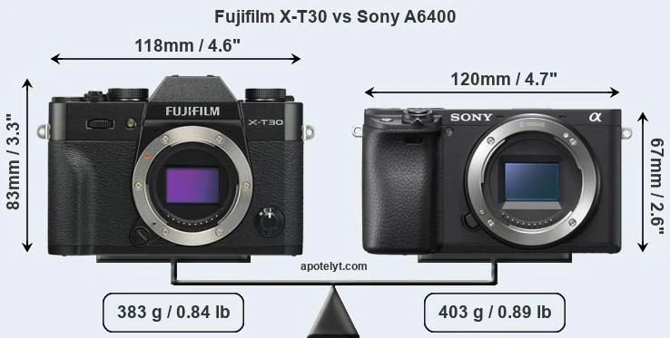 – Fujifilm X-T30: 118.4 x 82.8 x 46.8 mm; 383 g