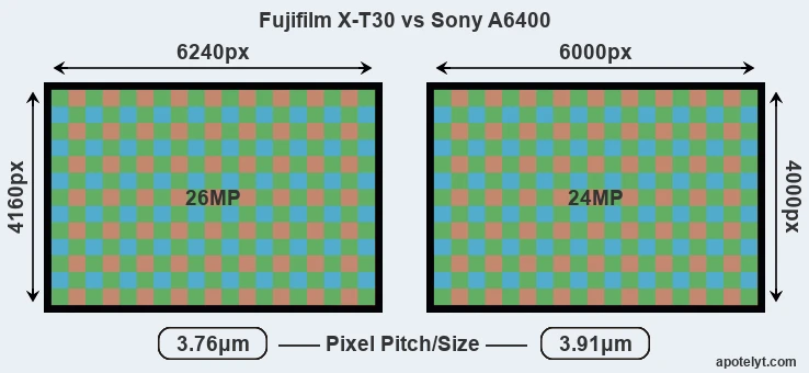 Hai cảm biến sử dụng bố cục điểm ảnh khác nhau. Sony a6400 sử dụng loại Bayer chuẩn, trong khi X-T30 sử dụng loại X-Trans của Fujifilm (cụ thể là thế hệ IV) đảm bảo sự xuất hiện của ít nhất một điểm màu xanh lá, một điểm màu đỏ và một điểm màu xanh dương trên mỗi đường (cả dọc và ngang).