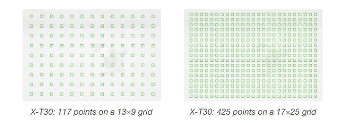 Sự sắp xếp điểm ảnh khác nhau cho phép X-T30 bỏ qua bộ lọc low-pass và tối đa độ sắc nét, tuy vậy không có nhiều phần mềm xử lý demosaicing tốt file RAW của Fuji.
