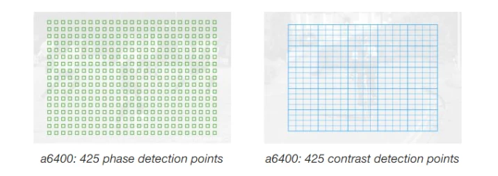 Trong khi đó, a6400 có 425 điểm lấy nét lai native cũng bao phủ một phần lớn của cảm biến. Máy có tốc độ lấy nét nhanh nhất thế giới, với thời gian phản hồi chỉ 0.02 giây.