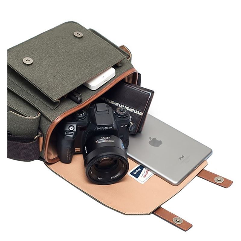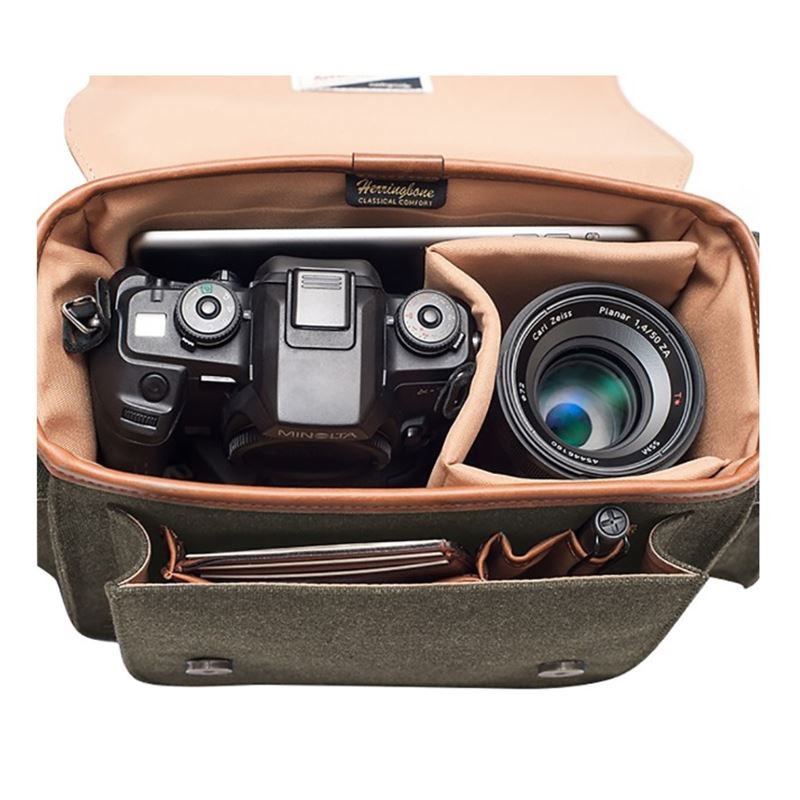 Herringbone Papaspocket 3 Medium Olive có sức chứa lớn có thể đặt 1 máy ảnh DSLR, 1 ống kính lớn tầm zoom 24-105mm, 1 chiếc máy tính bảng. Do đó, bạn hoàn toàn có thế thoải mái mang tất cả những dụng cụ cần thiết cho một buổi tác nghiệp theo bên mình.